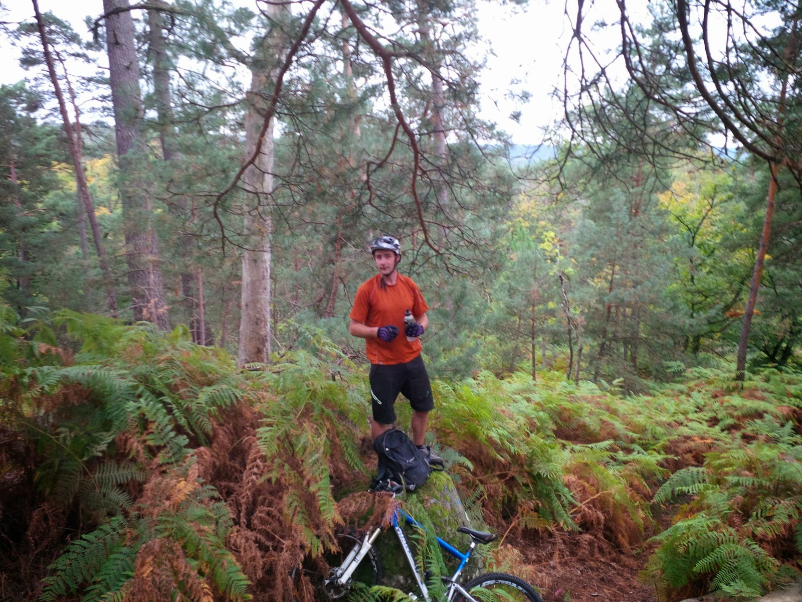 Voilà une rando qu'on attendait avec impatience, pour sa qualité mais aussi pour retrouver toute l'équipe presque au complet après les chutes de cette saison. Il ne manque que Xav et Gio, toujours en convalescence après leur chute en DH pendant les vacances. Il est maintenant temps de révéler un horrible complot destiné à mettre la pression à Bastien. Le "Raid Banzai" est un CR très nettement exagéré de notre sortie d'il y a 15 jours :-) . Objectif atteint, les mails ont largement circulé toute la semaine et effet collatéral, nous avons aussi inquiété Sebastien ! Rassurons donc tout le monde, nous n'en sommes pas encore à rivaliser avec Julien Absalon à 23 km/h de moyenne. Benoit est de retour sur son premier raid depuis la chute du mois de Mai. Bastien revient de vacances et au départ à 7h30, nous avons le plaisir de retrouver une belle équipe d'AOOC : Eric, l'homme au 26" collector, Christophe, Marco et enfin de retour sur les chemins, l'ami Franck ! :-) :-) . Je suis super content de le voir avec nous. Autre retour, Michel H. qui se joint à nous avec l'ami Olipic, qui sort tout juste d'une grosse séance de mécanique avec sa roue libre. Patrick est bien entendu des nôtres ,chaud bouillant pour un remake du raid banzai, ce qui inquiète bien sûr un peu Sebastien qui a toujours un doute sur nos intentions. Premier incident mécanique du jour, les colliers rilsan de mon support GPS se sont mystérieusement détendus dans la voiture, ça bouge de partout et je sors un collier de secours pour essayer de fixer tout ça proprement. Et zoup, c'est parti ! On papote sur les premiers tours de pédale, tout le monde est content de se revoir. Franck est moyennement confiant dans son état de forme, on s'emploie à le rassurer. Je vois Christophe et Bastien qui accélèrent devant, et j'ai très envie de voir si je peux les suivre. J'accélère et recolle aux deux lascars. Les jambes tournent toutes seules ce matin, je sens que la matinée va être amusante. On est immédiatement dans le vif du sujet, single à gogo, ça tourne, ça monte, il y a de la technique, du ludique, que du bonheur ! On discute un peu de la MB Race avec Christophe et Bastien en attendant le reste du groupe, un petit trou s'étant formé derrière nous. Tout le monde arrive, c'est reparti. Une belle montée caillouteuse, la pente reste raisonnable comparée aux murs du Pays Basque. Ca monte tranquillement sur la plaque, je ne résiste pas au plaisir de dépasser Bastien et Marco, ça n'arrive pas tous les jours ! Mais pas le temps de savourer, 100m plus loin, je sens un flou à l'arrière confirmé par Marco qui me dit que je suis à plat. Arrêt forcé, je n'entends pas de fuite, donc je tente de regonfler. Mais au bout de quelques minutes, il faut se rendre à l'évidence, mes efforts sont inutiles. Une inspection plus attentive révèle une belle déchirure dans le flanc droit de l'Ikon arrière. Zut .... Comme je n'arrivais pas à monter ce pneu en tubeless, j'ai ajouté un flap mais du coup, le pneu est tellement serré sur la jante que je sais que ça va être très difficile de le sortir. Michel et Olivier s'arrêtent pour m'aider. Olivier a un souci de transmission, la chaine ripe sur les trois plateaux, il décide de couper. On verra passer tout le club de St Michel au fur et à mesure. Je tente la rustine, ça semble marcher, au passage le téton de la valve se casse ( #$^^&# grrrrrr !!! ) et un essai de roulage provoque rapidement le dégonflage, il faut mettre une chambre. A trois, on finit par sortir le pneu, je n'ai pas regardé la montre, mais ça commence à faire un bon moment qu'on s'escrime après le vélo. Finalement, la chambre est en place, Michel m'aide à regonfler, je commence à avoir des crampes et à me transformer à vue d'oeil en shadock des bois à force de pomper, pomper, pomper ... Et enfin, on repart ! J'ai le moral à zéro, frustré par l'incident, c'est en fini de la belle bataille qui s'annonçait si bien. Heureusement, Michel est là et je réalise soudain qu'il est installé sur un beau 29"Merida Big Nine. Il est où le Trek ??? Volé chez lui pendant les vacances !! Voilà un nouveau converti, et j'en connais un qui testerait bien un Merida à grande roues :-) . On descend dans la foulée un talus super raide où le 29" fait merveille, il me faut plusieurs kms pour retrouver l'envie d'appuyer sur les pédales. Finalement, petit à petit, je me remets dans le rythme et nous finissons par rejoindre le ravito 1 où Benoit et Patrick m'ont gentiment attendu, mais commençaient à se demander où j'étais passé. Sans doute plus de 20 minutes perdues dans l'affaire. On repart tous les quatre, à peine le temps de grignoter un petit bout de gâteau de semoule, mais Benoit en bon camarade en a dévoré plusieurs pour que les organisateurs ne restent pas avec trop de victuailles sur les bras. Tout à son honneur. A peine le temps de donner trois coups de pédale, que Benoit constate que son pneu arrière a été victime du même mal que le mien : un passage trop rapproché sur un rocher coupant, et son racing ralph a le flanc abimé et perd de l'air. Arrêt, il veut mettre une chambre. Je l'en dissuade, on tente de secouer le pneu sur le flanc pour que le latex agissse et on gonfle un bon coup. Ca va tenir dis-je. Et j'ai raison, ça tient ... 1 km. Nouvel arrêt réparation, Michel part devant, on croise quelques copains d'ADP. Nous repartons quelques minutes plus tard. Difficile une nouvelle fois de reprendre le rythme. Nous arrivons à une intersection traditionnelle de cette rando où je me perds à chaque fois : il y des chemins balisés partout, au moins quatre possibilités, des pancartes dans tous les sens. Je suis bloqué par des concurrents aussi hésitants que moi, j'entends Patrick dire "par là" , mais il a déjà disparu, je ne sais pas par où il est parti. Pas de Benoit en vue non plus. Je continue tout droit, tenaillé par le doute en roulant au ral