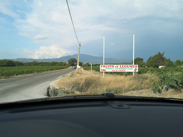 Me voilà donc reparti vers le Ventoux . 26km dans ce sens . D'ailleurs, j'aperçois le sommet, au loin, vraiment loin . Bigre, va falloir pédaler si je veux remonter tout ça en 2h .